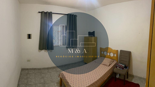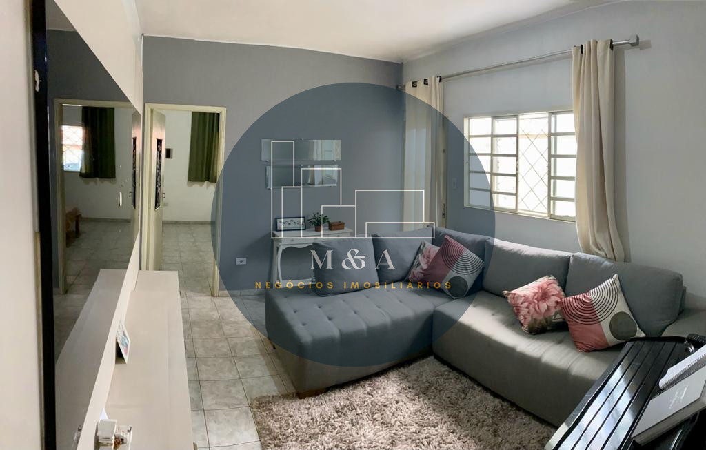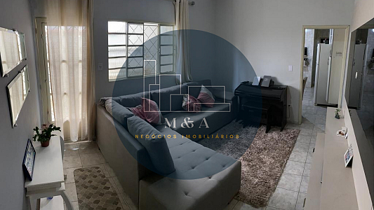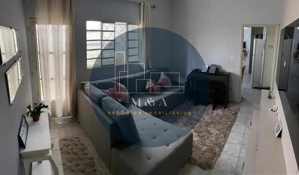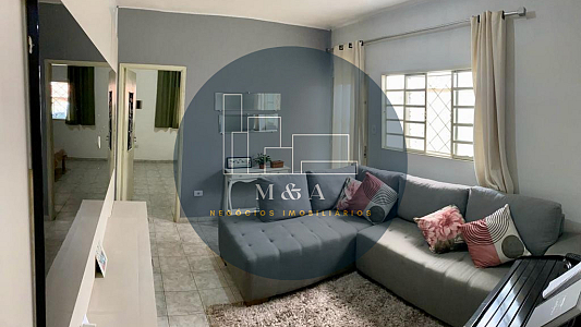 Casa térrea com 2 quarto, sala, cozinha, banheiro, cômodos amplos, área de serviço e garagem coberta.